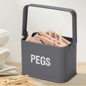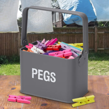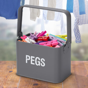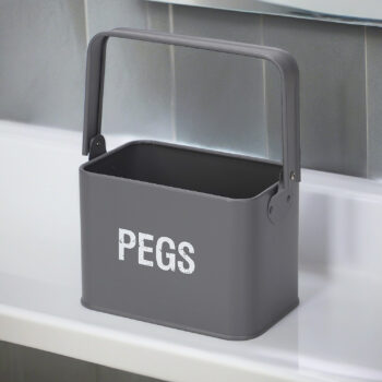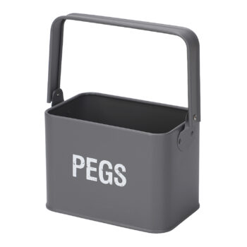 Crafted from galvanized steel with a Grey powder-coated finish, this open-top tin features a white ‘Pegs’ text on the front and a practical handle for easy transportation.